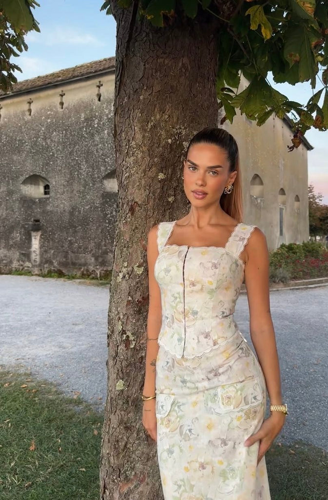 The skirt sits high on the waist and features delicate lace trimming along the waistband for a polished touch. Twin side slits create natural movement with every step, while the subtle sheen of the fabric catches the light beautifully. A timeless and romantic piece for warm-weather escapes. Style it with its matching Isabelle Blouse for a timeless summer set.