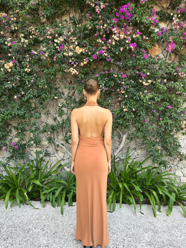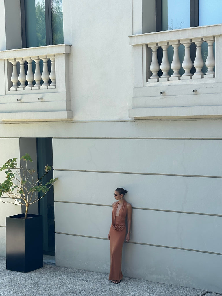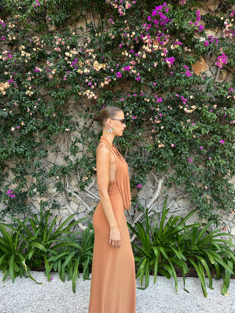 Effortlessly chic and undeniably striking, this halter maxi dress is designed to turn heads. Crafted in a warm terracotta hue, it features a plunging neckline that gracefully transitions into a fluid, draped detail across the waist—creating a flattering, sculpted silhouette. The open back and floor-length hem exude modern elegance, perfect for sunset soirées, destination weddings, or any occasion where you want to make a statement.