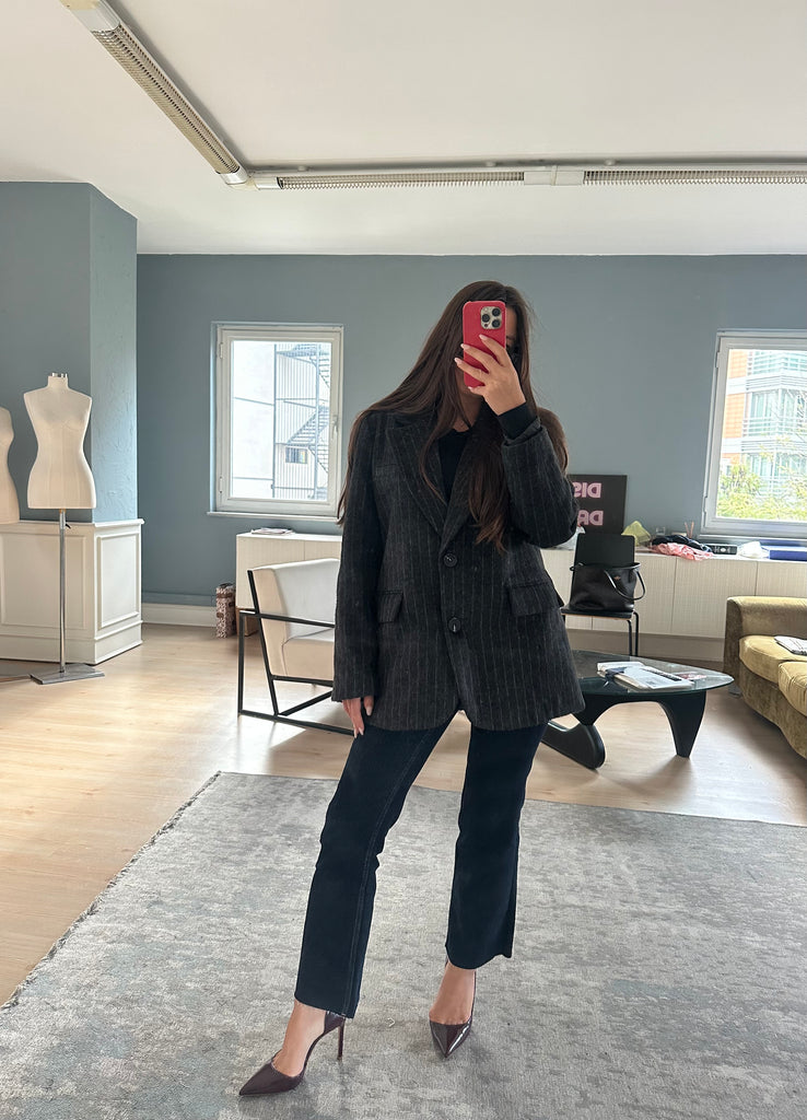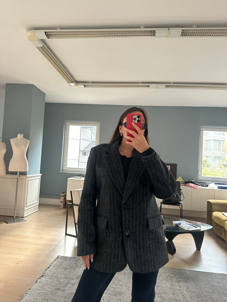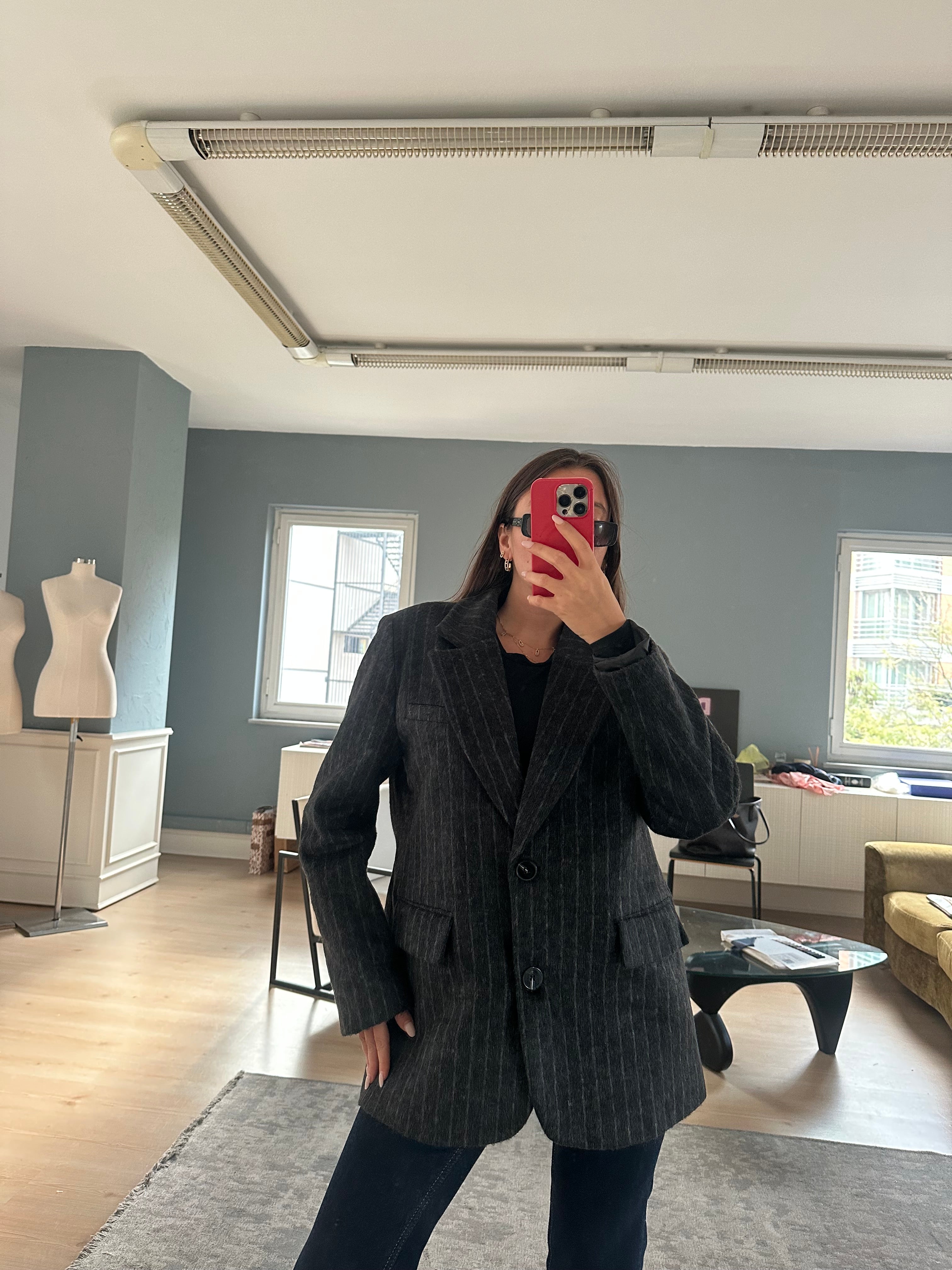 A timeless interpretation of modern elegance. Crafted from a soft-touch fabric with fine vertical stripes, this blazer adds a sophisticated edge to both office looks and everyday outfits. Its oversized fit ensures comfort while blending masculine tailoring with feminine charm.